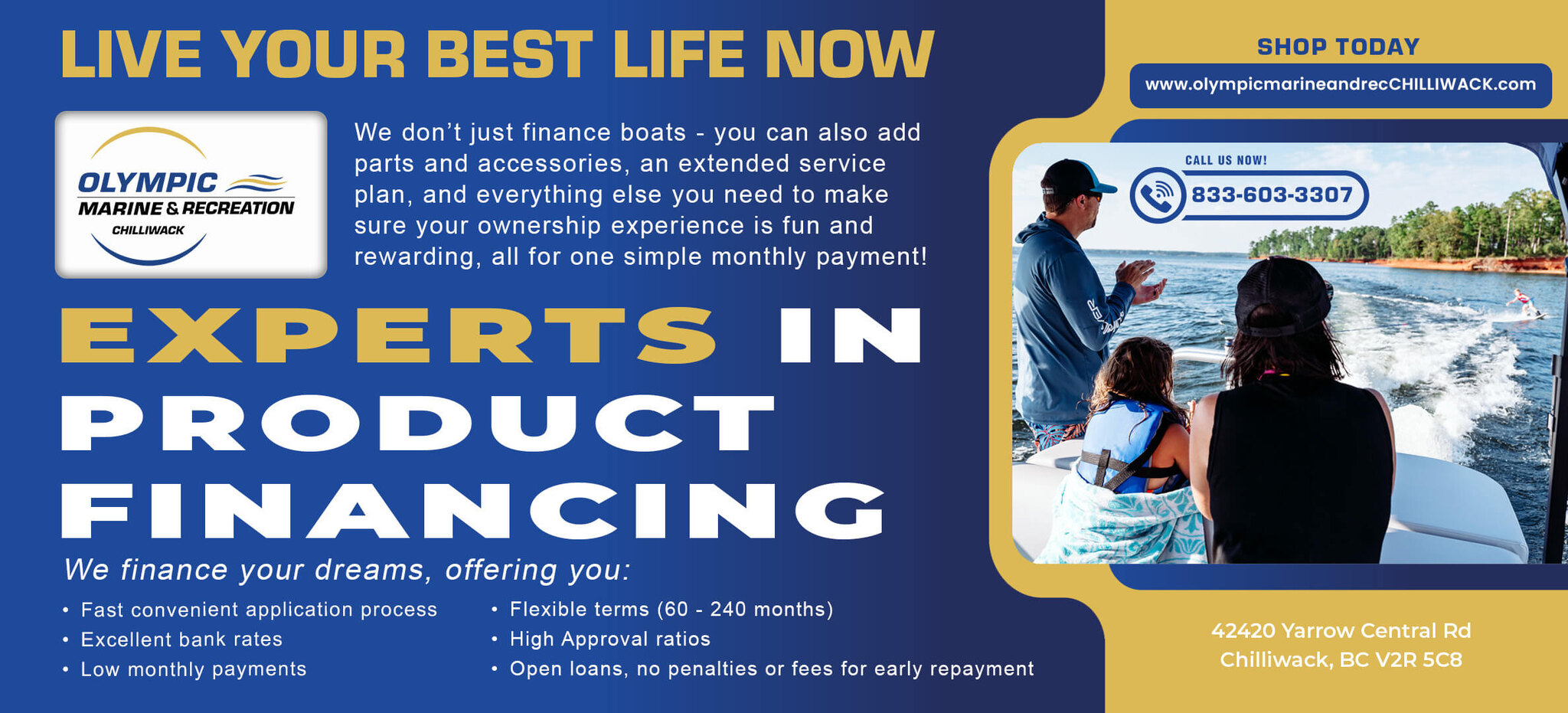 At Olympic Marine & Recreation - CHILLIWACK, we are boating and watersports enthusiasts, and there's nothing we enjoy more than helping our customers find the kind of fun and adventure that a quality boat can bring. If you're considering financing a new boat from quality brands, you're in good hands with our finance department. We are thrilled to get the opportunity to help you set up a financing plan that gets you out on the water as soon as possible in the Chilliwack area.