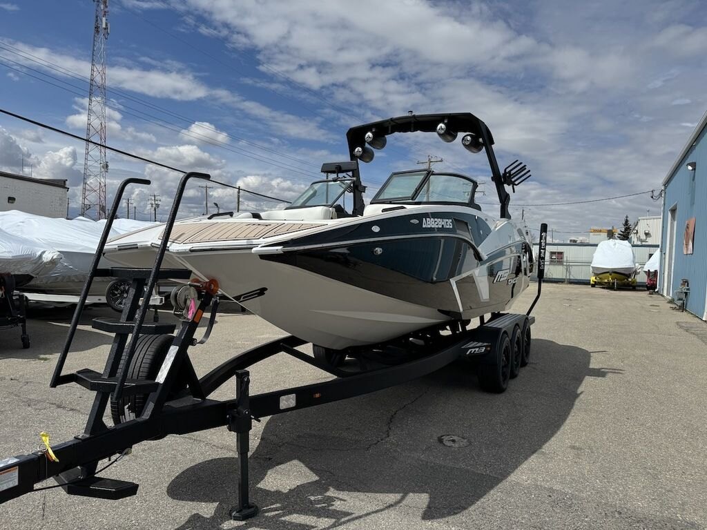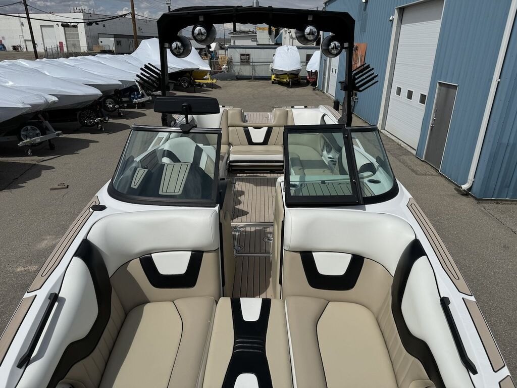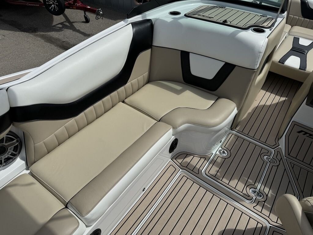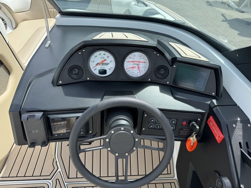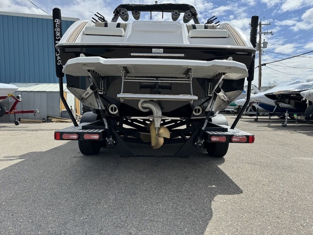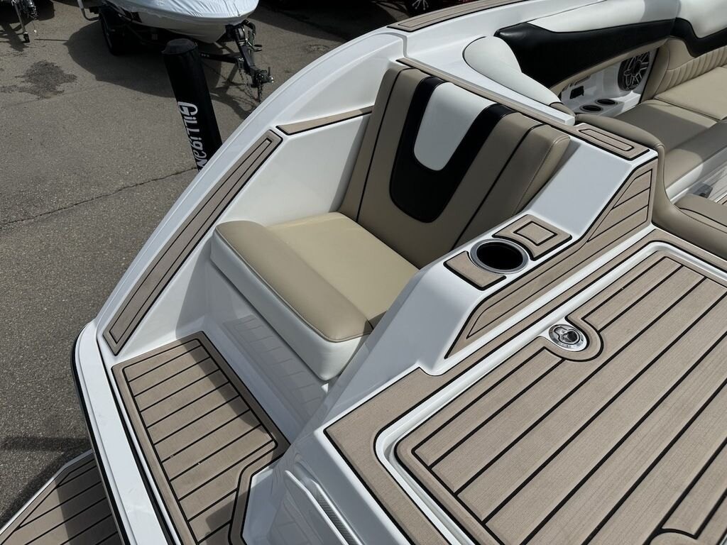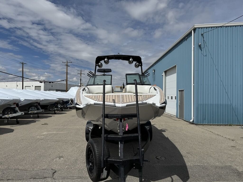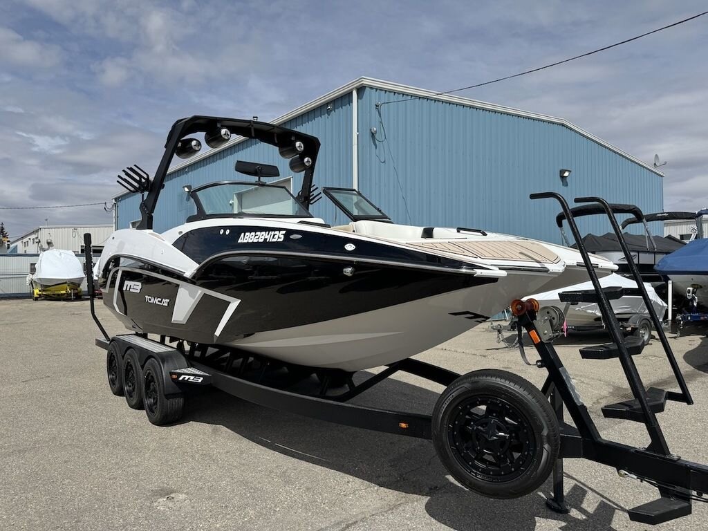 The Tomcat F24 Alpha is the ultimate wakeboard boat. MB's team riders Trever Maur, Josh Twelker, and Randall Harris spent weeks on the water helping them perfect the best all around wakeboat in the industry. With high sides, rear facing transom seating, and a pickle fork bow, this boat is ready to turn amateurs into pros. Options include: Indmar Raptor 6.2L Roush Supercharged 575, Power Tower, Metallic Gel Coat upgrade, PTM Clamping Board Racks, MB Switch Surf System, MB Plug and Play 3150 lbs. Ballast System, Gator Step floor kit, Surf Lights, 4 Tower Speakers, 12" Subwoofer, 8.8 Cockpit Speakers, Heater, Heated Captains Chair, Fender Clips, Bimini with Board Storage, Full One Piece Cover, Dual Batteries with isolation switch, Flip Up Rear facing Seats, Touch Screen Dash, Custom Triple Axle Trailer with Matching Spare.