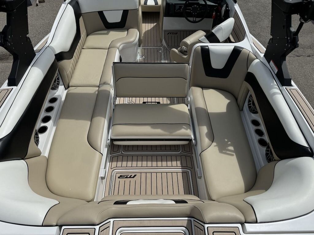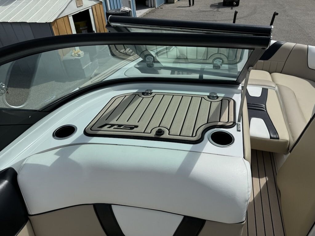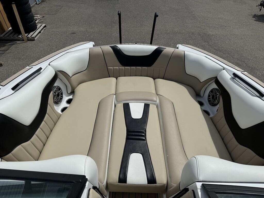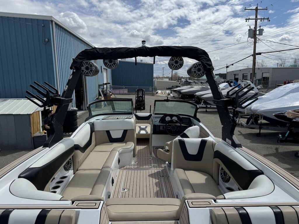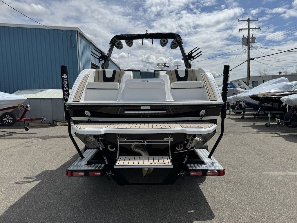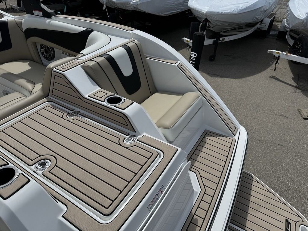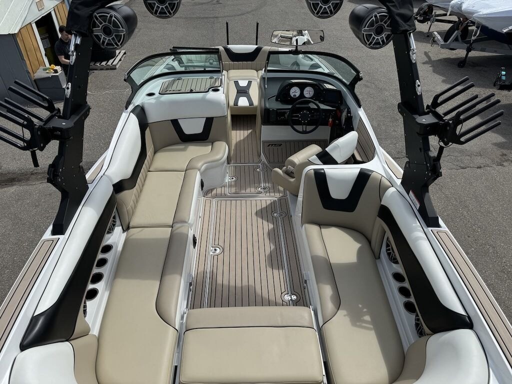 The Tomcat F24 Alpha is the ultimate wakeboard boat. MB's team riders Trever Maur, Josh Twelker, and Randall Harris spent weeks on the water helping them perfect the best all around wakeboat in the industry. With high sides, rear facing transom seating, and a pickle fork bow, this boat is ready to turn amateurs into pros. Options include: Indmar Raptor 6.2L Roush Supercharged 575, Power Tower, Metallic Gel Coat upgrade, PTM Clamping Board Racks, MB Switch Surf System, MB Plug and Play 3150 lbs. Ballast System, Gator Step floor kit, Surf Lights, 4 Tower Speakers, 12" Subwoofer, 8.8 Cockpit Speakers, Heater, Heated Captains Chair, Fender Clips, Bimini with Board Storage, Full One Piece Cover, Dual Batteries with isolation switch, Flip Up Rear facing Seats, Touch Screen Dash, Custom Triple Axle Trailer with Matching Spare.