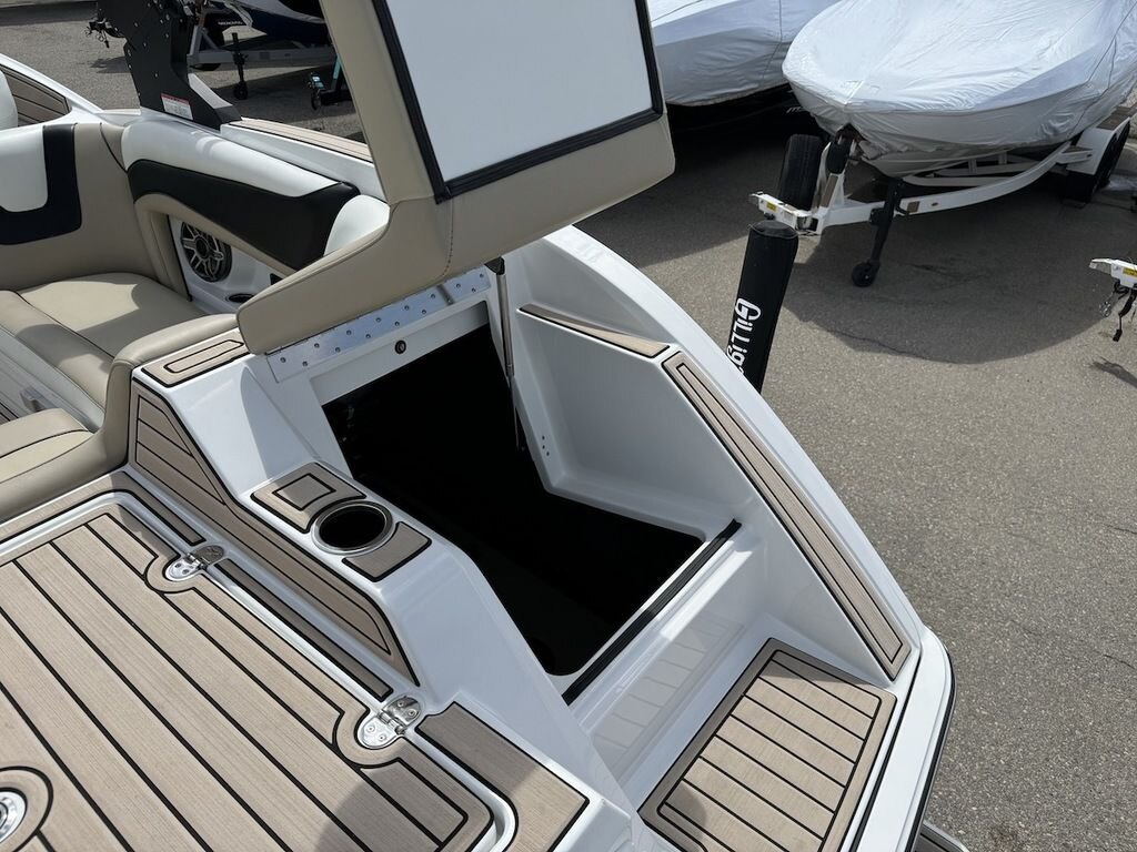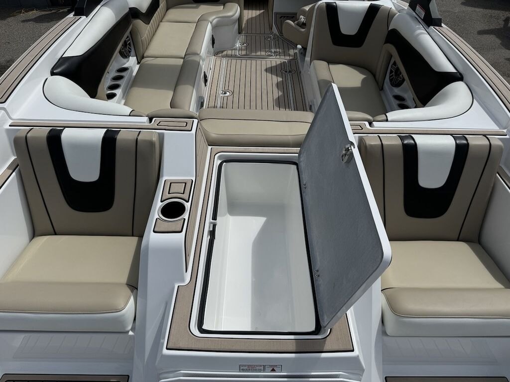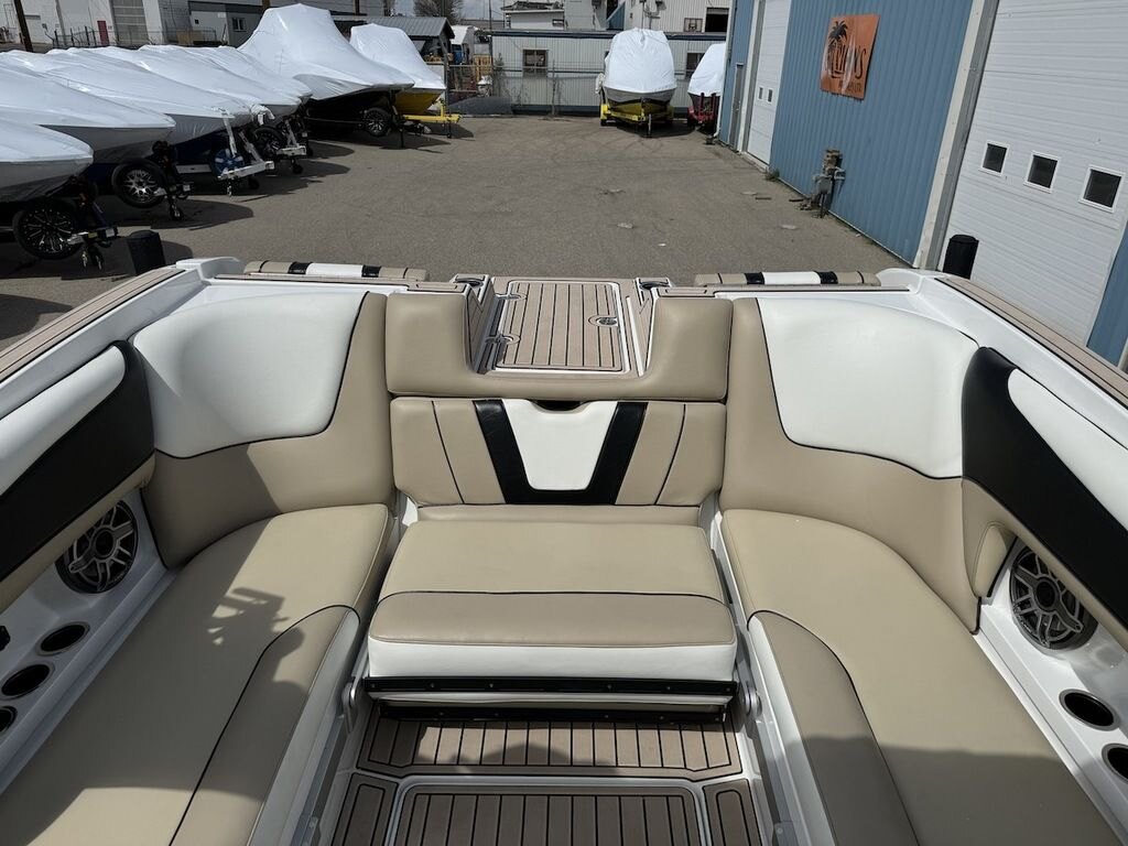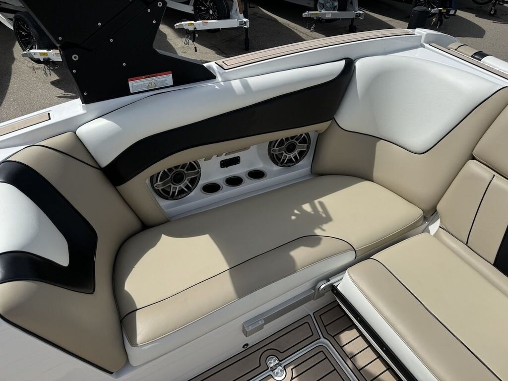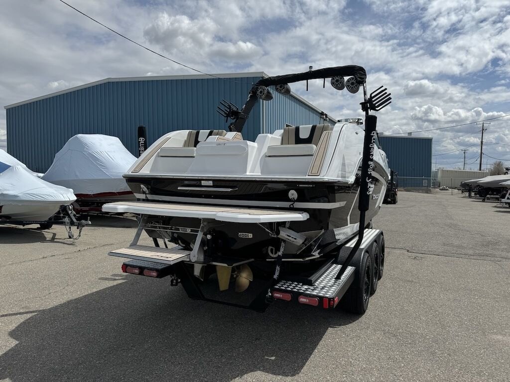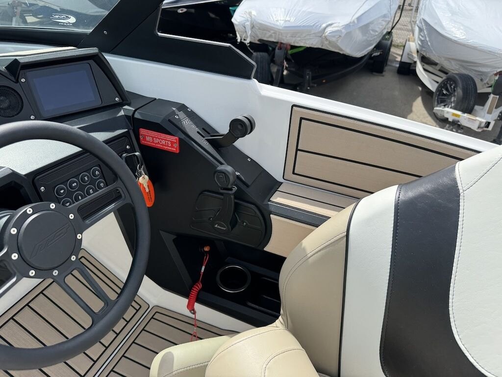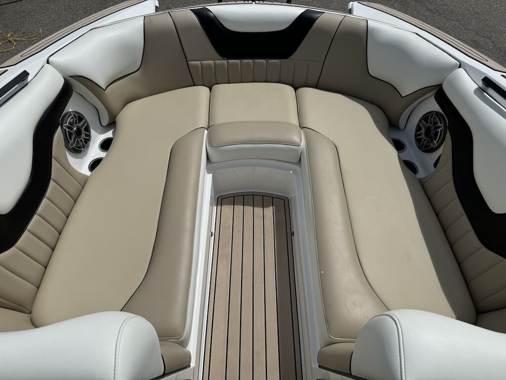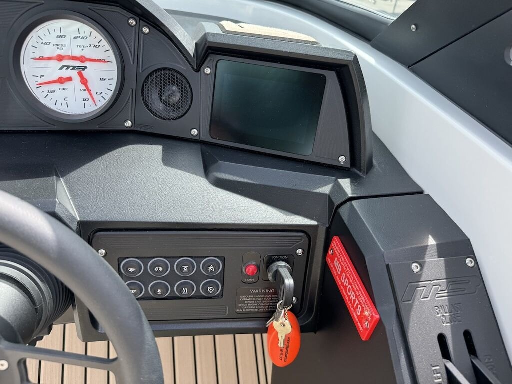 The Tomcat F24 Alpha is the ultimate wakeboard boat. MB's team riders Trever Maur, Josh Twelker, and Randall Harris spent weeks on the water helping them perfect the best all around wakeboat in the industry. With high sides, rear facing transom seating, and a pickle fork bow, this boat is ready to turn amateurs into pros. Options include: Indmar Raptor 6.2L Roush Supercharged 575, Power Tower, Metallic Gel Coat upgrade, PTM Clamping Board Racks, MB Switch Surf System, MB Plug and Play 3150 lbs. Ballast System, Gator Step floor kit, Surf Lights, 4 Tower Speakers, 12" Subwoofer, 8.8 Cockpit Speakers, Heater, Heated Captains Chair, Fender Clips, Bimini with Board Storage, Full One Piece Cover, Dual Batteries with isolation switch, Flip Up Rear facing Seats, Touch Screen Dash, Custom Triple Axle Trailer with Matching Spare.