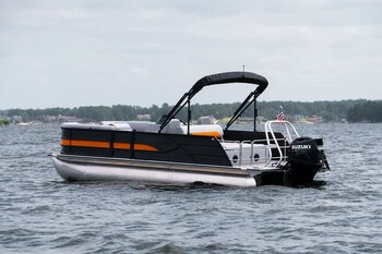 Measures approximately 22 ft in length with an 8 ft 5 in beam, spotlighting a classic tritoon profile with ample space, perfect for up to 15 people.