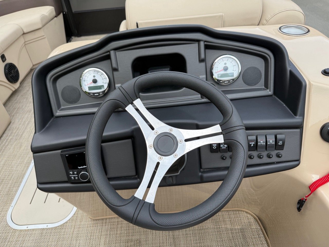 Comes standard with powder-coated railings, a custom fiberglass console, and analog gauges featuring speed, tachometer, voltage, and fuel.