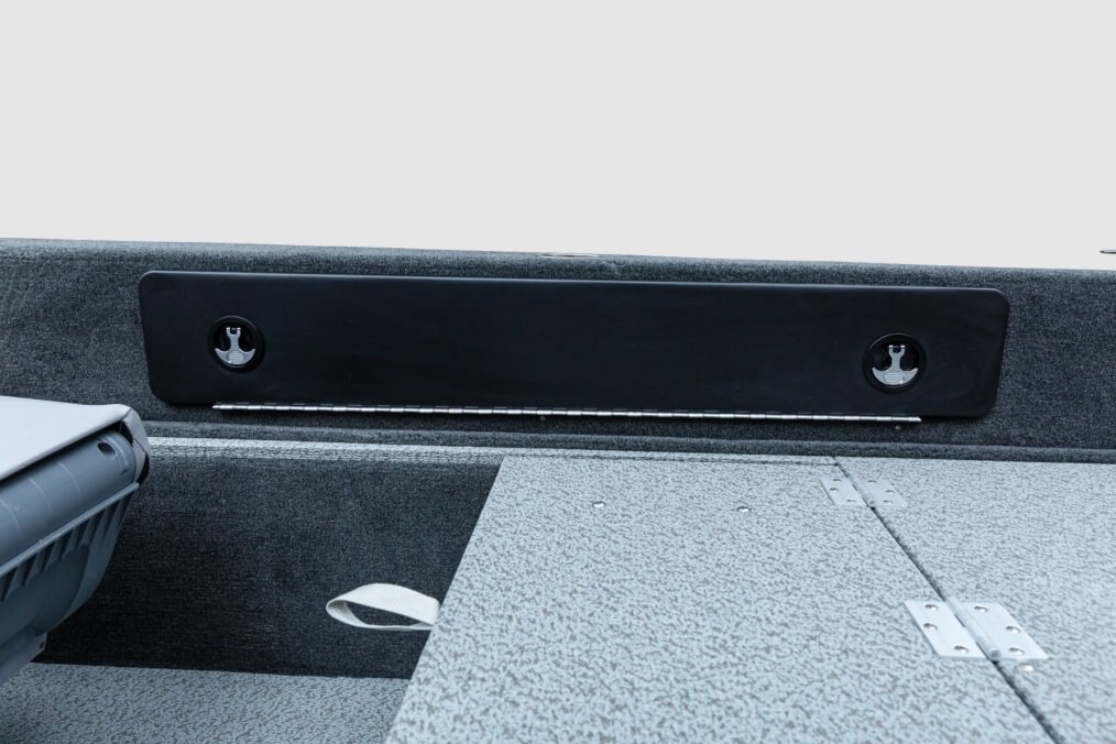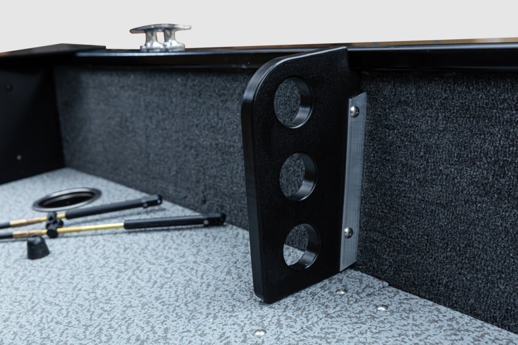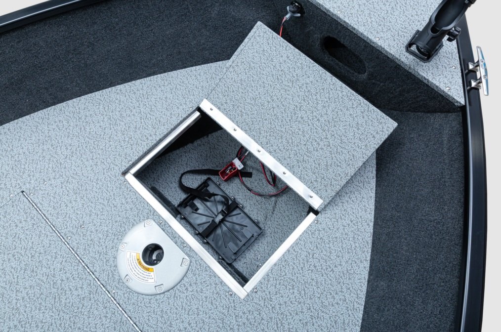 Decks and Storage Rear battery storage area 5 drink holders Large port and starboard bow storage compartments Large bow center storage compartment Large rear casting deck with seat mount
