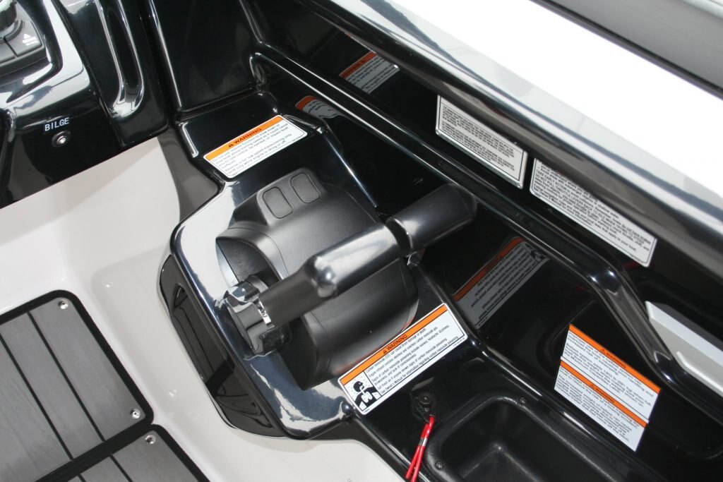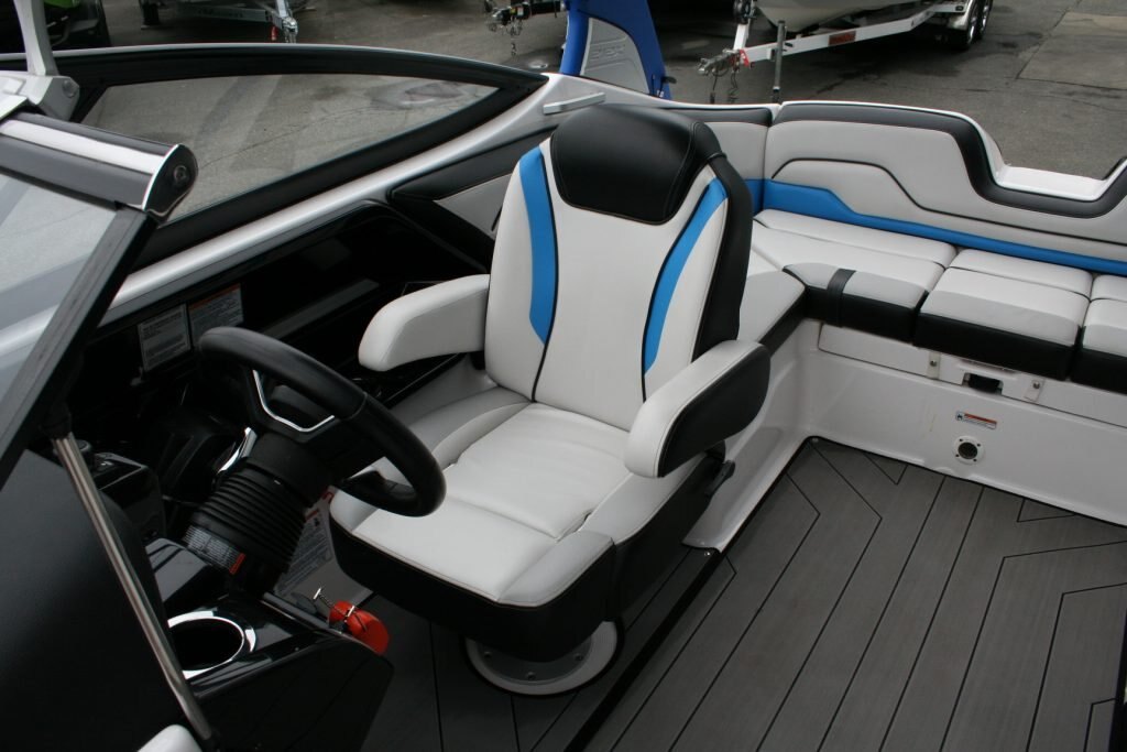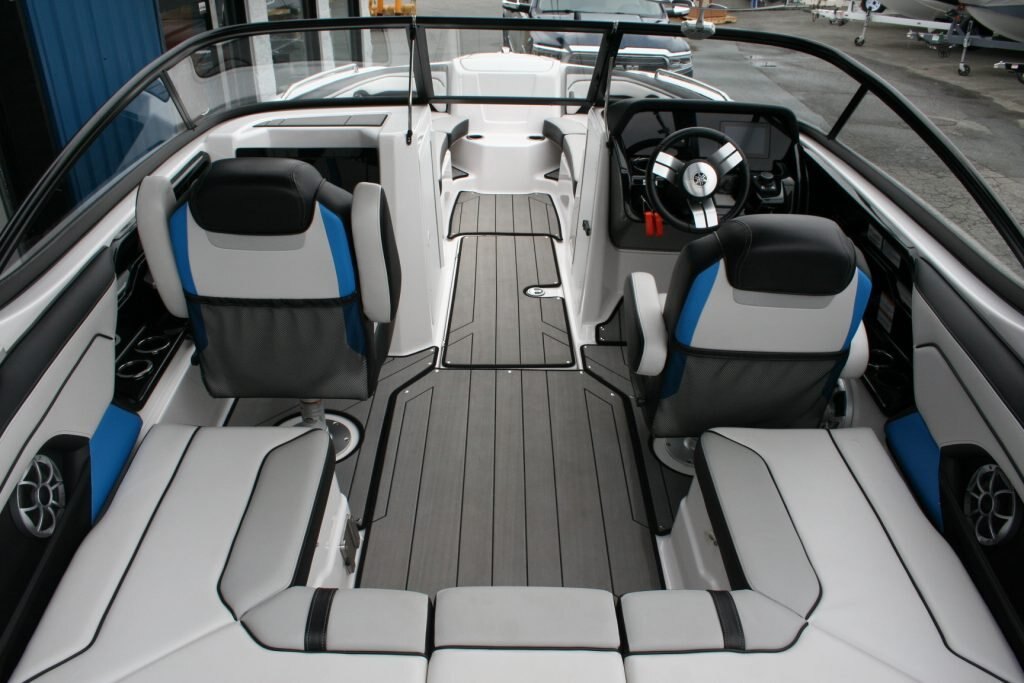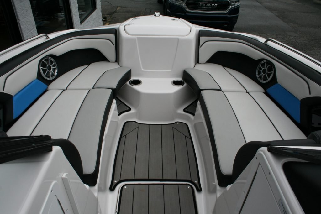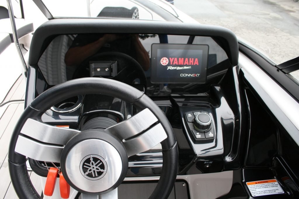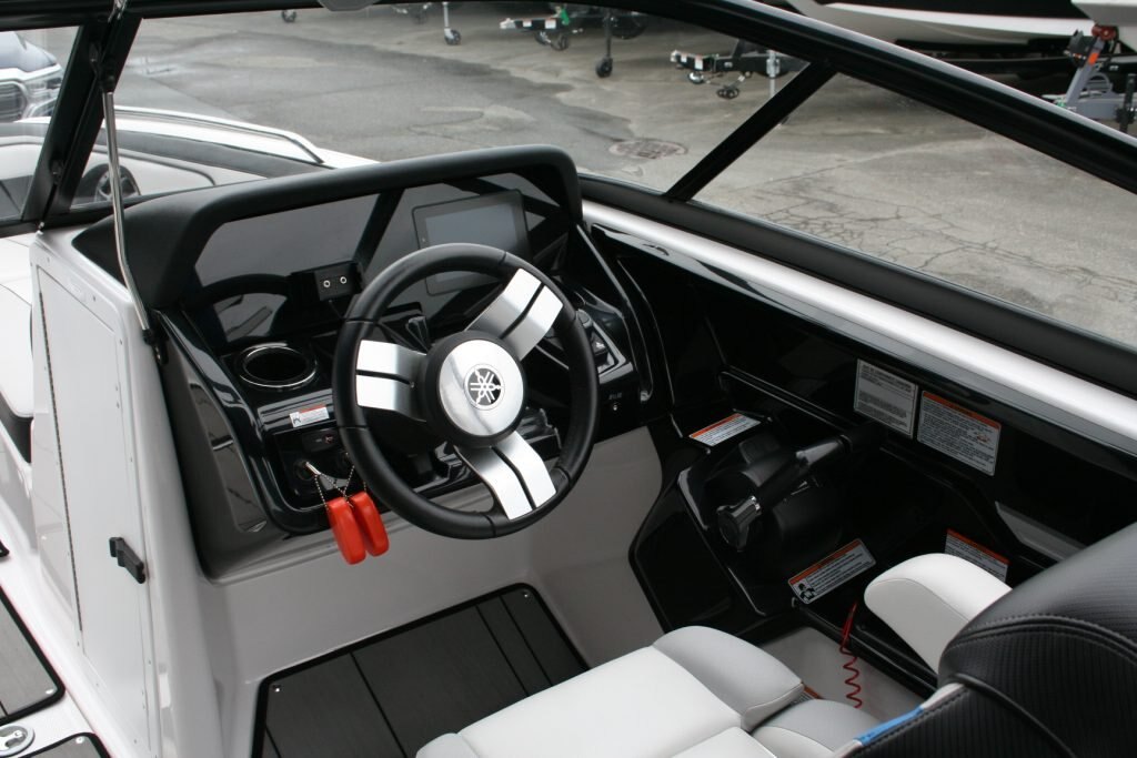 Twin Yamaha 1.8L engines, Dual Batteries with dual disconnect switches, Pull up cleats, Yamaha Connext screen with depth finder, 600lb Plumbed in center ballast below the floor, Cockpit or Transom table, Non skid removable foam flooring, Twin captains chairs with Bolsters, Blue Tooth stereo with Wet Sounds Soundbar on the wake tower, Swivel wake racks, Bimini top, Boat cover, Tandem axle trailer with swing tongue and spare tire.