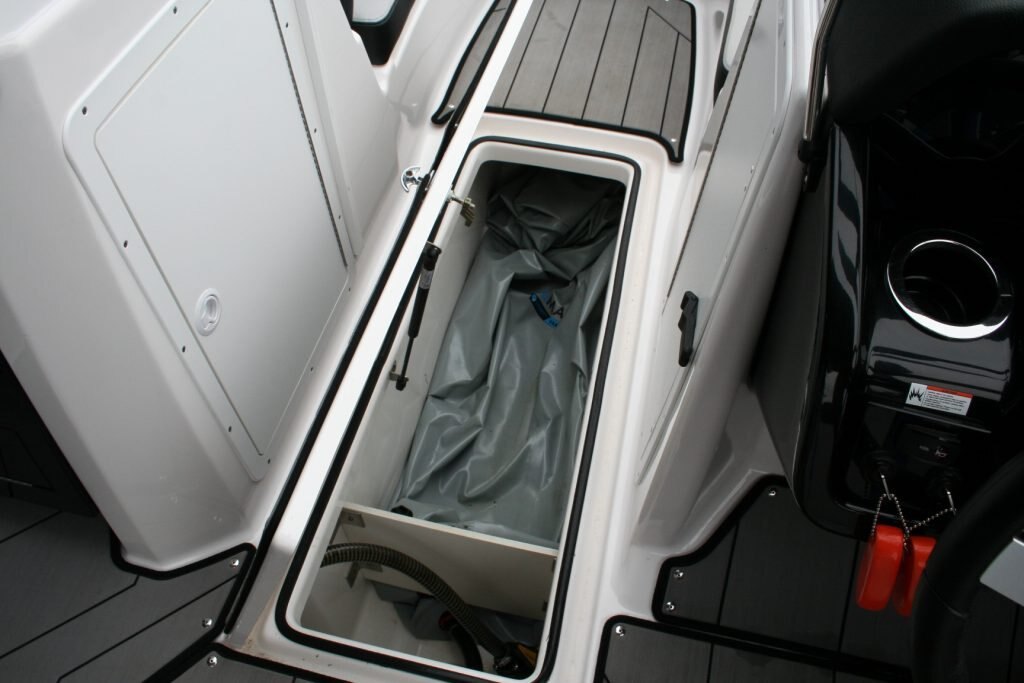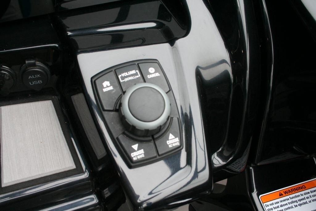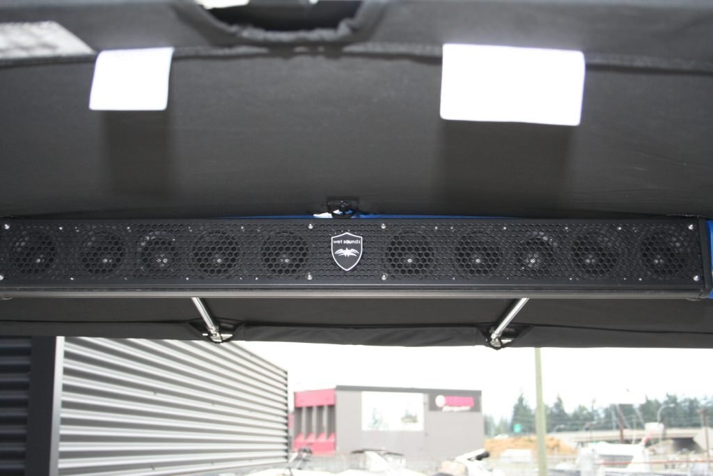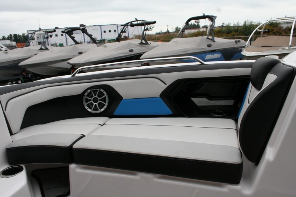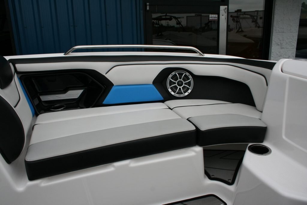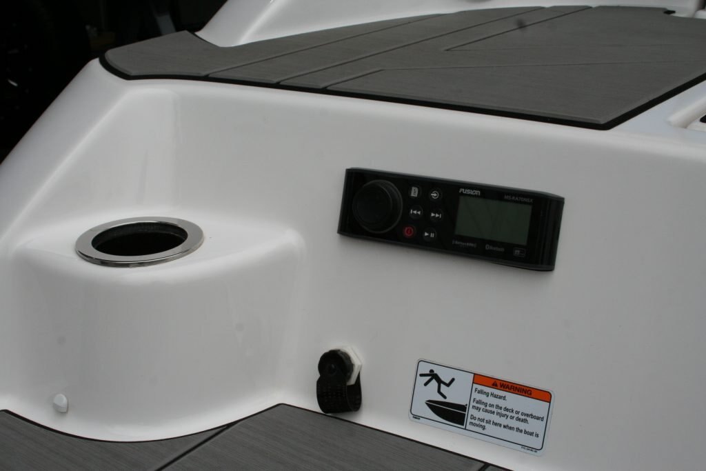 Twin Yamaha 1.8L engines, Dual Batteries with dual disconnect switches, Pull up cleats, Yamaha Connext screen with depth finder, 600lb Plumbed in center ballast below the floor, Cockpit or Transom table, Non skid removable foam flooring, Twin captains chairs with Bolsters, Blue Tooth stereo with Wet Sounds Soundbar on the wake tower, Swivel wake racks, Bimini top, Boat cover, Tandem axle trailer with swing tongue and spare tire.