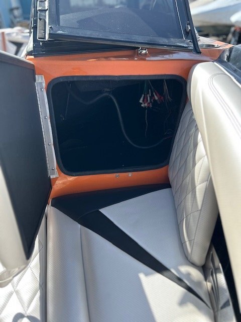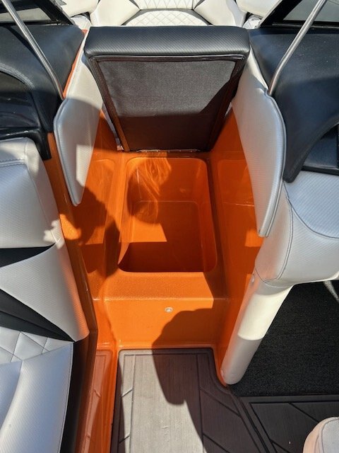 Transom: Walk-over transom with wet locker storage on either side, easily transformed into a large upholstered sun deck.